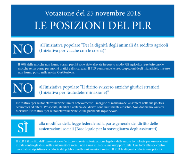 Ecco le indicazioni di voto del PLR per i temi in votazione il prossimo 25 novembre: le due iniziative "Per la dignità degli animali da reddito agricoli (Iniziativa vacche con le corna)" e "Il diritto svizzero anziché giudici stranieri (Iniziativa per l'autodeterminazione)" e la modifica della legge federale sulla parte degnerale del diritto delle assicurazioni sociali (Base legale per la sorveglianza degli assicurati).
